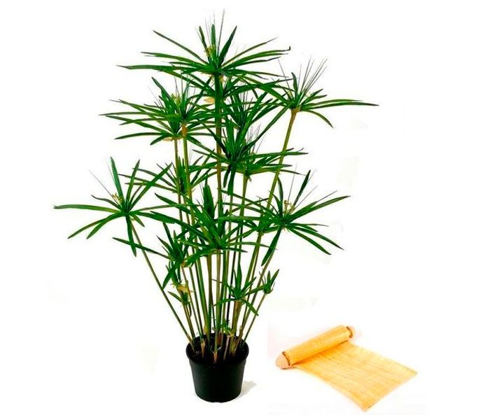 w naturze najczęściej występuje roślina w tropikalnym pasie Afryki. Ta wieloletnia roślina może osiągnąć wysokość około 300 cm, aw górnej części prosta łodyga ma trójkątny kształt. Na szczycie łodygi znajduje się rozeta liściowa, a liście są dość długie, zwisające. Kwiatostany wyrastają z kątów rozety liściowej, składają się z około 100 kwiatów znajdujących się na cienkich szypułkach. Taki kwiat rośnie w cieple o wysokiej wilgotności. Co ciekawe, papier jest wykonany z jego łodyg.