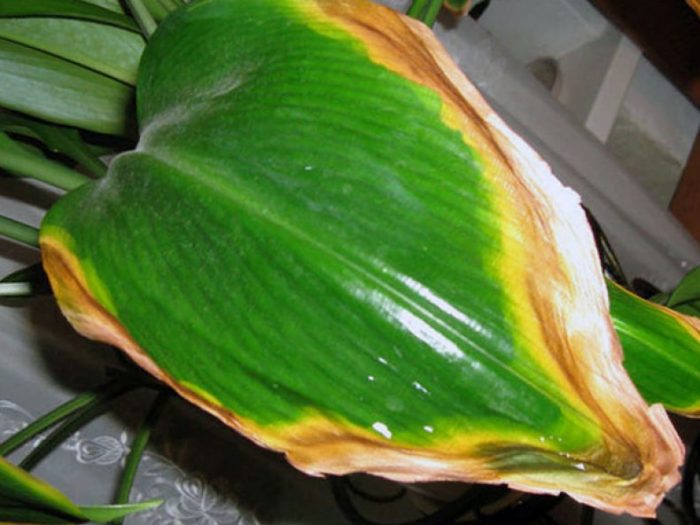 - żółknięcie liści . W przypadku, gdy tylko jedna lub dwie blachy stały się żółte, jest to całkowicie naturalny proces. Ale jeśli liście żółkną masowo, a na jej powierzchni pojawiają się ciemne plamy, oznacza to, że musisz podjąć pilne środki, aby uratować kwiat. Żółknięcie liści obserwuje się w przypadku, gdy: roślina nie ma wystarczającej ilości wody z powodu zbyt rzadkiego lub rzadkiego podlewania, płyn regularnie stagnuje w mieszance gleby, a także z powodu hipotermii krzewu.