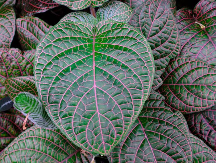 tak niezbyt wysoką roślinę w przyrodzie można znaleźć wyłącznie w lasach deszczowych Peru i Kolumbii. Owłosione łodygi prawie rozprzestrzeniają się na powierzchni gleby, w związku z tym są dość łatwe do rozmnażania przez warstwy. Ciemnozielone eliptyczne lub jajowate płytki liściowe mają czerwone żyły. Ich długość wynosi 5-10 centymetrów, a szerokość 4-6 centymetrów.