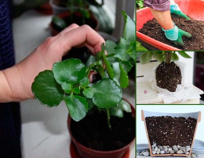 Kalanchoe jest przeszczepiany tylko wtedy, gdy rośnie silnie i staje się ciasny w doniczce. Na dnie pojemnika do sadzenia konieczne jest wykonanie dobrej warstwy drenażowej z małych kawałków cegły lub ekspandowanej gliny. Pozwoli to uniknąć stagnacji wody w podłożu. Do przesadzania młodych krzewów odpowiednia jest mieszanka gleby, która obejmuje torf, piasek, glebę liściastą i darniową w stosunku 1:1:2:4. W razie potrzeby możesz kupić gotowe podłoże dla sukulentów w sklepie. Podczas przesadzania epifitycznego Kalanchoe do mieszanki ziemi zaleca się wlać niewielką ilość próchnicy.