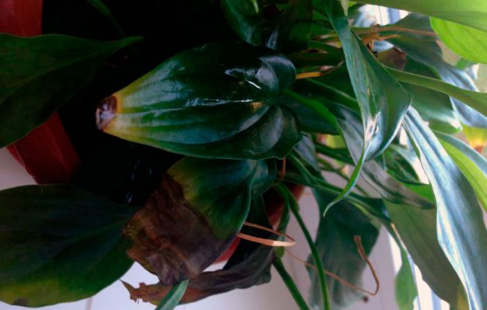 - choroby . Jeśli woda stagnuje w podłożu, na liściach tworzą się brązowawo-żółte plamy. A jeśli w pomieszczeniu jest nadmiernie suche powietrze, liście stracą swoją dekoracyjność. Nawet kwiat reaguje negatywnie na nadmiar lub brak składników odżywczych.