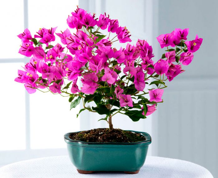 Bugenwilla może być uformowana w drzewo bonsai z kilkoma gałęziami i jednym pniem. Aby to zrobić, na krzaku musisz zostawić 2-3 gałęzie i usunąć wszystkie inne. Ten rodzaj musi być utrzymywany przez bardzo długi czas, aż drzewo stanie się zdrewniałe. Następnie musisz przyciąć wszystkie centralne gałęzie na kikucie. Następnie musisz poczekać, aż młode pędy wyrosną na krzaku. Przez cały ten czas musisz kontrolować ich wzrost: długie pędy potrzebują przycinania i szczypania, nadmiar jest usuwany, a te, które są skierowane w złym kierunku, są korygowane drutem. Po zdrewniałych gałęziach kopie zapasowe należy usunąć. Na krótko przed rozpoczęciem okresu spoczynku formowanie Bonsai zostaje zawieszone, w którym to przypadku krzew będzie miał czas na uwolnienie młodych pędów i ułoży na nich pąki kwiatowe. A wraz z nadejściem wiosny gęste i spektakularne kwiatostany ozdobią Bonsai.