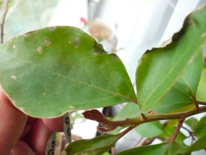 w przypadku, gdy na powierzchni blaszek liściowych utworzyły się miękkie plamki białego koloru, sugeruje to, że w mieszaninie gleby stale obserwuje się stagnację cieczy, a pomieszczenie jest słabo wentylowane. W takim przypadku pomieszczenie musi być regularnie wentylowane,a podlewanie jest ograniczone do umiarkowanego. Wszystkie liście z Plamami są odcięte.