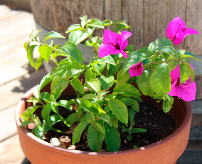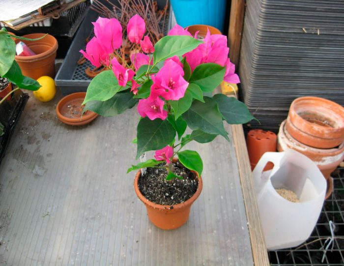 odpowiednia doniczka do sadzenia powinna być tylko o 20 mm większa niż poprzednia pojemność lub o kilka centymetrów większa niż system korzeniowy krzewu wzięty wraz z bryłą ziemi. Jeśli pojemnik jest zbyt przestronny, wówczas zieleń i system korzeniowy będą intensywnie rosły w bugenwilli, co będzie miało bardzo negatywny wpływ na kwitnienie. Ponadto cienkie korzenie nie są w stanie w krótkim czasie opanować całej objętości mieszanki gleby, co oznacza, że ciecz stagnuje w niej, co doprowadzi do zakwaszenia podłoża. Pojemność powinna być wysoka, ale niezbyt szeroka.