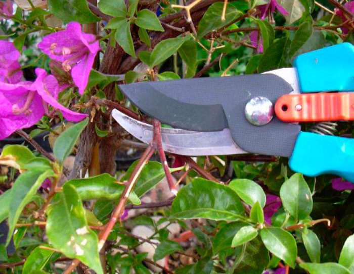 ważną procedurą podczas uprawy bugenwilli w warunkach pokojowych jest jej przycinanie. Za jego pomocą możesz nie tylko nadać krzakowi odpowiedni kształt, ale także stymulować kwitnienie. W ciągu jednego roku wykonuje się kilka przycinania.