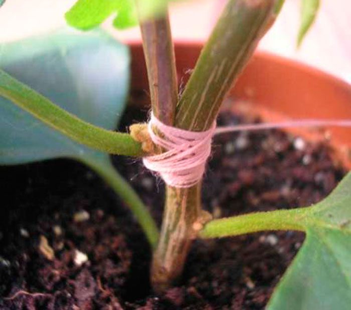 aby stworzyć wielokolorowy spektakularny wygląd bugenwilli, gałęzie innej odmiany można sadzić na łodygach krzewu. Na przykład sadzonka z krzewu z białymi przylistkami jest szczepiona na roślinie z przylistkami w kolorze czerwonym. Instrukcje szczepienia krok po kroku: