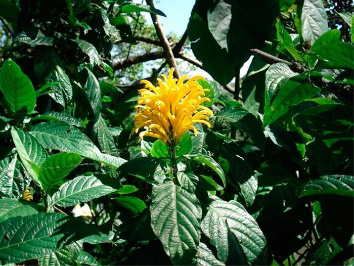 na wysokości jakobinia może osiągnąć około 150 cm, po pewnym czasie łodyga rośnie lekko zdrewniała. Kształt zielonych blaszek liściowych jest eliptyczny, a na ich powierzchni czasami występują plamki i kropelki. Istnieją 2 rodzaje kwiatostanów w takiej roślinie, dzięki którym wszystkie gatunki są podzielone na grupy. Tak więc w pierwszej grupie formowanie kwiatów obserwuje się na pędach bocznych, aw drugiej rosną kwiatostany wierzchołkowe.