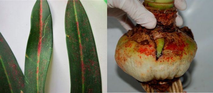 możesz zrozumieć, na co wpływa hippeastrum, dzięki jego wyglądowi. W obecności czerwonych plam na cebulkach i liściach możemy powiedzieć, że na krzew wpływa oparzenie grzybicze. Pojawienie się białej płytki na nadziemnej części krzewu wskazuje na obecność mączniaka prawdziwego. Jeśli łuski żarówki zgniły, a liście zwisały, oznacza to, że jest dotknięta zgnilizną.