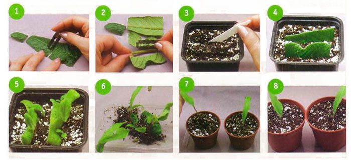 do rozmnażania można również użyć podłużnej części płyty liściowej. Aby to zrobić, arkusz jest układany na desce twarzą w dół, a następnie żyłka Środkowa jest oddzielana ostrym ostrzem. W powstałych dwóch częściach blachy miejsca cięcia należy posypać proszkiem węglowym. Następnie sadzi się je w rowkach pionowo w dół, pogłębiając je o 1/3 wysokości ogonka liściowego, a następnie podłoże jest lekko zagęszczane, po czym jest podlewane, a pojemnik jest przykryty folią na górze. Pojemnik jest przestawiany w dobrze oświetlonym i ciepłym miejscu. Młode rośliny pojawią się wzdłuż całej płyty liściowej z bocznych żył. Na niewłaściwej powierzchni płytki na środkowej żyle konieczne jest wykonanie dwudziestomilimetrowych cięć co 2 cm, a następnie łodyga liścia jest przypięta do powierzchni zwilżonego podłoża, po czym jest spryskana środkiem grzybobójczym. Pojemnik z sadzonkami należy przykryć szkłem na górze, a następnie przenieść do dobrze oświetlonego miejsca, chronionego przed bezpośrednim działaniem promieni słonecznych. Po pojawieniu się młodych pędów schronienie należy nieco przesunąć.