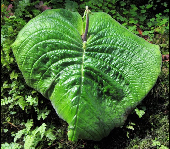 ta roślina ma tylko jedną płytkę liściową, której szerokość wynosi około 0,3 m, a długość wynosi do 0,4 m.Wysokość łodygi wynosi około 50 cm, w jej górnej części rośnie kwiatostan racemose, składający się z kwiatów, których korona jest jasnofioletowa, a ziew ciemniejszego odcienia, kolor dolnej wargi jest biały.