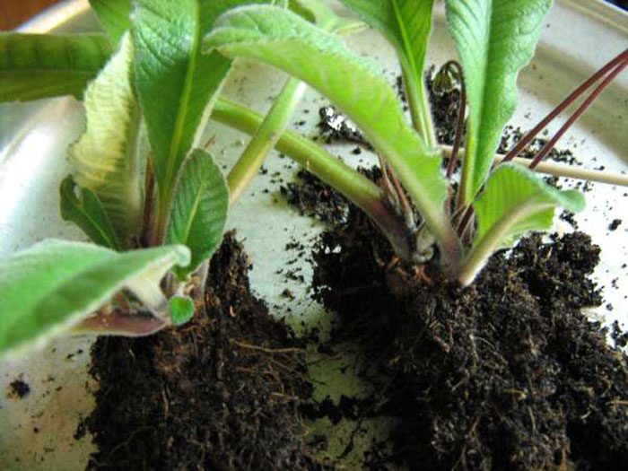 możesz rozmnażać, dzieląc krzew, silnie zarośnięty streptocarpus. Na początek podłoże w doniczce podlewa się niewielką ilością wody, a następnie krzew wyciąga się ze zbiornika i usuwa resztki mieszanki gleby z systemu korzeniowego. Następnie pobiera się ostre narzędzie, które oddziela część grubego korzenia liśćmi. Pozostaw delenki na chwilę na świeżym powietrzu, aby miejsca cięcia dobrze wyschły, a następnie należy je potraktować proszkiem węglowym. Przygotowany garnek na 2/3 jest wypełniony świeżym podłożem, a następnie umieszcza się w nim odciętą rozetę i posypuje mieszanką gleby do poziomu szyjki korzenia. Następnie podłoże należy nieco zagęścić, a krzew podlać ciepłą wodą. Aby delenka lepiej się zapuściła, garnek jest przykryty celofanem. Możesz także przyspieszyć ukorzenienie i aktywować wzrost młodych liści, skracając do połowy duże płytki liściowe lub można je całkowicie przyciąć. Po pewnym czasie krzew wyrósł z delenki zacznie kwitnąć.