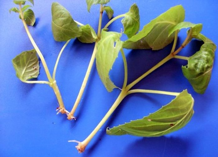 podczas zbioru sadzonek należy zauważyć, że ich długość powinna wynosić od 50 do 70 mm.aby sadzonki się ukorzeniły, można je sadzić w piasku lub umieścić w pojemniku z wodą. Sadzonki dadzą korzenie w ciągu około 20-30 dni. Do sadzenia ukorzenionych sadzonek stosuje się pojedyncze doniczki o średnicy dochodzącej do 90 mm, które są wypełnione mieszanką gleby składającą się z piasku, próchnicy, darni i ziemi liściastej(1:1:1:1). Aby krzewy rosły efektownie i gęsto, w 1 doniczce należy sadzić kilka sadzonek jednocześnie. W takich krzakach kwiaty powinny pojawić się w tym samym roku. Do rozmnażania wolno rosnących gatunków fuksji stosuje się metodę sadzonek, podczas gdy procedura ta jest przeprowadzana w ostatnich tygodniach letnich.