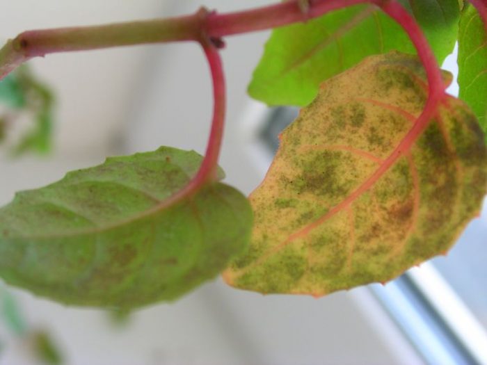 jeśli liście latają zimą, krzew należy usunąć z jasnego światła, a powstające pąki należy uszczypnąć. Nawet latanie liści może być związane z nadmiernie rzadkim podlewaniem, zbyt niską wilgotnością powietrza i bardzo wysoką temperaturą. Fuksja może zrzucić pąki w zbyt słabym świetle, przedwczesnym podlewaniu i bardzo wysokiej temperaturze powietrza.