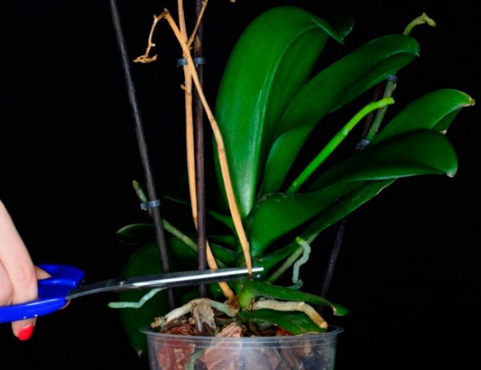 po kwitnieniu krzewu musisz obserwować starą strzałkę przez chwilę. Jeśli strzałka stanie się zwiędła i żółta, należy ją odciąć. Jeśli jednak strzałka jest soczysta i zielona, istnieje duże prawdopodobieństwo, że po kilku miesiącach odpoczynku tworzą się na niej pąki kwiatowe. Należy pamiętać, że nowa strzałka, zanim pojawi się na niej zakładka pąków kwiatowych, będzie musiała rosnąć. W przypadku, gdy stara strzałka jest zbyt długa, konieczne jest jej skrócenie, podczas gdy należy ją przyciąć powyżej rozwiniętej nerki o 10 mm. Należy pamiętać, że im wyżej przycięta szypułka, tym mniej kwiatów utworzy się na bocznej strzałce. Jednak szypułki nie można przyciąć poniżej trzeciego pąka, w przeciwnym razie roślina nie zakwitnie stosunkowo długo.