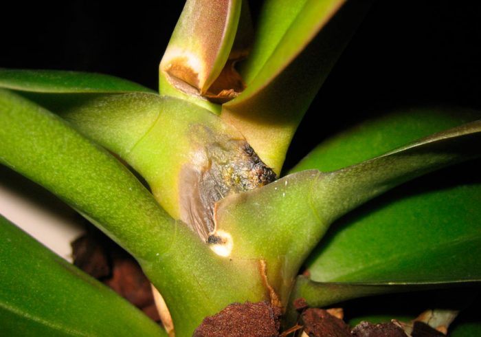 rozwój chorób niezakaźnych występuje z kilku powodów: nadmierne oświetlenie, nierównomierne podlewanie, stosowanie pestycydów, niewłaściwe karmienie. U chorego okazu końce liści zaczynają wysychać, korzenie umierają, a także wpływają na inne tkanki orchidei i następuje rozwój różnych plam. Spróbuj znaleźć i wyeliminować przyczynę, z powodu której krzew zachorował, a będziesz miał szansę go uratować. Należy jednak pamiętać, że bardzo trudno jest ożywić taką roślinę.