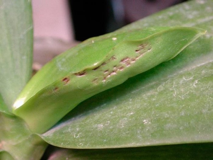 dość często Orchidea choruje na pokrzywkę. Chora roślina ma zmiany w płytkach liściowych, które na wczesnym etapie objawiają się dużymi plamami o średnicy dochodzącej do 20-30 mm. przyczyną rozwoju choroby może być wysoka wilgotność, zbyt niska Temperatura powietrza i słaba wentylacja w pomieszczeniu. Wystarczy zacząć właściwie dbać o kwiat, a on wyzdrowieje.