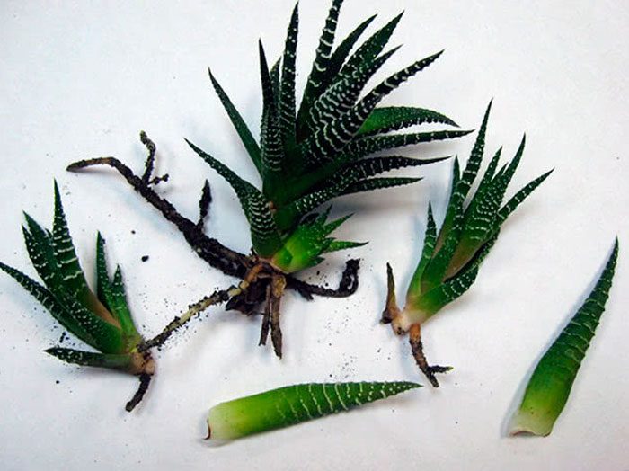 jeśli boczne rozety haworthii już utworzyły korzenie, należy je ostrożnie oddzielić od krzewu macierzystego i natychmiast posadzić w doniczce wypełnionej zwilżonym podłożem. W przypadku oddzielenia sadzonek z dwiema lub trzema płytkami liściowymi, które nie mają korzeni, miejsce cięcia będzie musiało być traktowane popiołem drzewnym, po czym będą suszone przez kilka dni, a następnie sadzone w celu ukorzenienia w zwilżonym piasku. Po uformowaniu korzeni przesadza się je do doniczki wypełnionej podłożem. Cięcie liści wymaga tej samej procedury. Po przycięciu pozostawia się go do wyschnięcia na zewnątrz przez kilka dni, a następnie sadzi w celu ukorzenienia w piasku lub luźnym podłożu. Dopóki korzenie nie wyrosną, nie jest konieczne podlewanie podłoża w doniczce, należy go tylko lekko zwilżyć z opryskiwacza. Pojemnik nie powinien być przykryty folią ani szkłem, ponieważ w takich warunkach cieplarnianych istnieje duże prawdopodobieństwo, że łodyga zgnije. Do rozmnażania dobrze nadaje się wiosna.