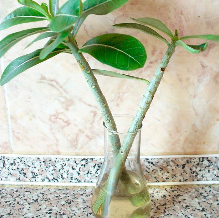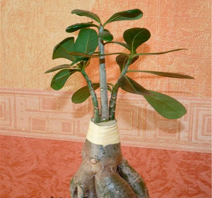 aby zaszczepić taką kulturę, możesz użyć innego Adenium lub Oleandra. Wykonaj nacięcia na przeszczepie i podkładce za pomocą bardzo ostrego noża, a następnie są one łączone ze sobą, a następnie rośliny są mocno przymocowane (możesz użyć specjalnego sprayu). Upewnij się, że Temperatura powietrza w pomieszczeniu nie jest mniejsza niż 30 stopni, wilgotność powietrza powinna być wysoka, a także potrzebujesz jasnego oświetlenia. Nowy krzew należy chronić przed bezpośrednimi promieniami słońca, a kiełki, które pojawiły się na podkładce, należy natychmiast odciąć.