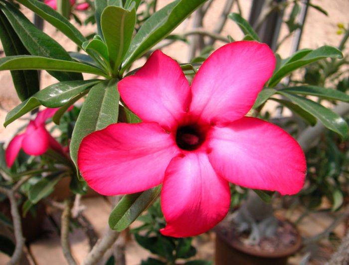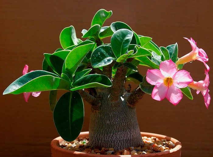 roślina Adenium (Adenium) jest przedstawicielem rodziny Kutrav. W obrębie tego rodzaju występuje 5 gatunków. Ten sukulent występuje naturalnie w Środkowej i Południowej Afryce. W warunkach pokojowych takie małe drzewa lub krzewy osiągają wysokość około 0,35 m.pień tego kwiatu jest gruby. Powierzchnia błyszczących blach jest aksamitna. Dość duże kwiaty są pomalowane na biało lub ciemno szkarłatny kolor. Wśród ludzi taka roślina ma wiele innych nazw, najbardziej popularna jest "róża pustyni", ponieważ ten kwiat przypomina różę.