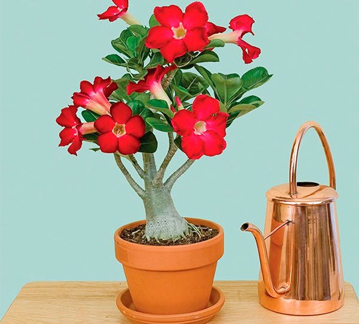 dbając o kwiat uprawiany w pomieszczeniach, powinien zapewnić terminowe podlewanie. Ta procedura jest przeprowadzana natychmiast po całkowitym wyschnięciu podłoża w pojemniku. Zimą podlewanie powinno być bardzo rzadkie i rzadkie. Jeśli zimą Adenium jest utrzymywane w temperaturze powietrza 15-20 stopni, wówczas podlewa się je dopiero po całkowitym wyschnięciu podłoża. Jeśli krzew zimuje w chłodniejszym miejscu, podlewanie jest niezwykle rzadkie lub całkowicie zatrzymywane. Młode krzewy należy podlewać również bardzo ostrożnie. Kiedy krzew zacznie rosnąć po raz pierwszy wiosną, będzie musiał zostać podlany 15-20 dni po tym, jak pąki się pojawią, a krzew zacznie rosnąć.