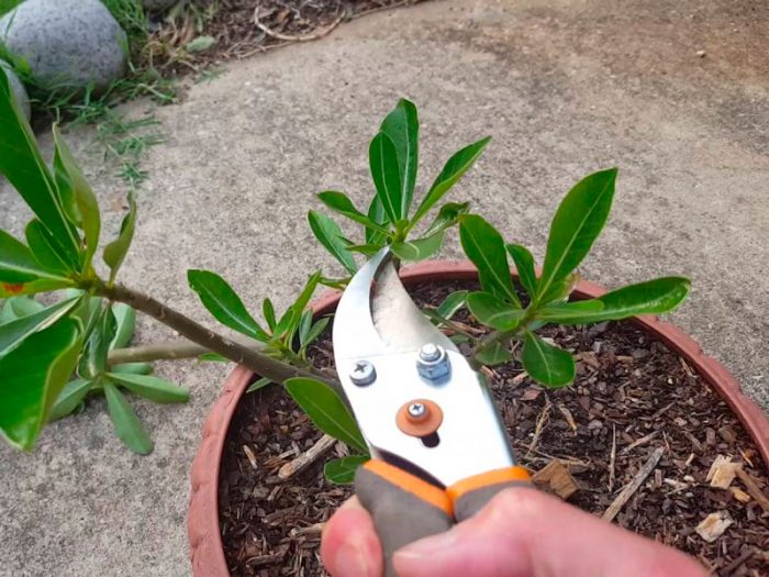 przycinanie krzewów odbywa się tylko w razie potrzeby i robi to tylko wiosną. Aby uformować krzew w postaci drzewa, musisz skrócić gałęzie boczne o 1/3 długości. Aby utworzyć krzew, należy go przyciąć poniżej. Tworzenie Adenium trwa dość długo i jest dość skomplikowane, ale jeśli wszystko zostanie zrobione poprawnie i na czas, wynik będzie imponujący.