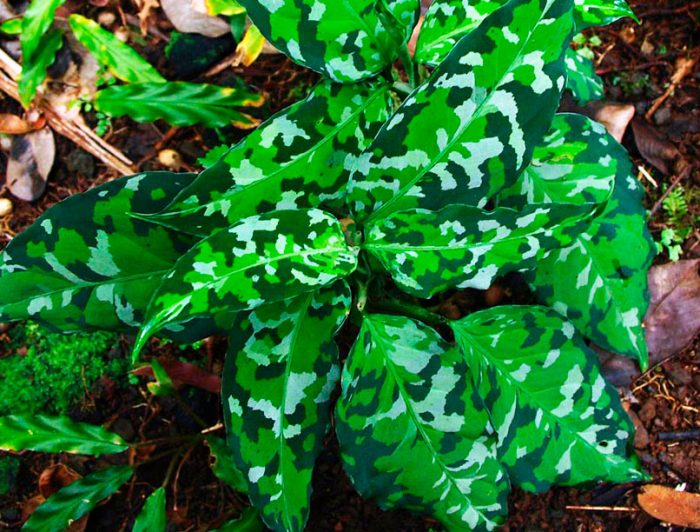 gatunek pochodzi z wilgotnych lasów znajdujących się na Wyspach Sumatra i Borneo. Wysokość rozgałęzionego pnia wynosi około 0,6 m. kształt ciemnozielonych dużych blaszek liściowych jest wydłużony-eliptyczny. Na ich powierzchni nierównomiernie znajdują się szare plamy. W niektórych odmianach plamy te są pomalowane na srebrno-biały kolor. Jagody są czerwone.