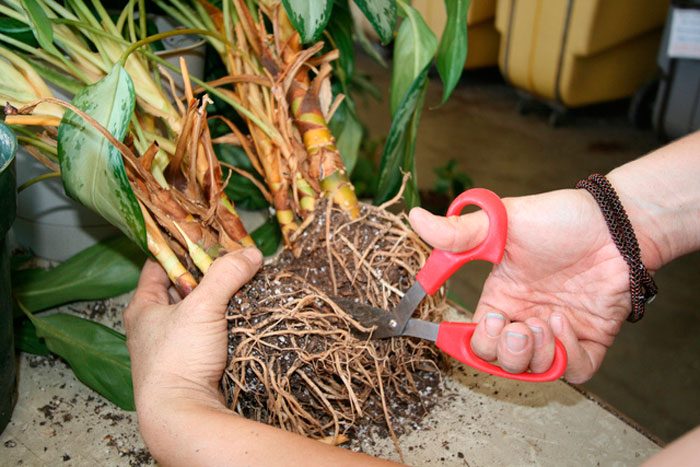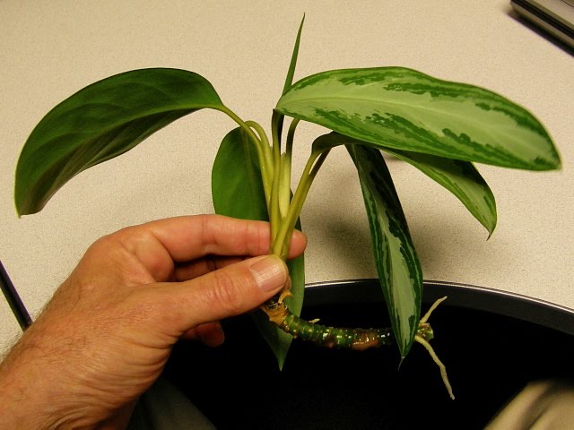 możliwe jest rozmnażanie sadzonek aglaonem dopiero po rozpoczęciu rozgałęzienia pnia lub gdy pień jest wyraźnie widoczny po zakończeniu etapu rozety. Łodyga musi zostać odcięta, tak jak w przypadku wierzchołkowego cięcia. Następnie jest podzielony na kilka części, z których każda powinna osiągnąć długość 90-100 mm, podczas gdy na każdej sadzonce powinny znajdować się płytki liściowe. Pozostaw segmenty na 24 godziny na zewnątrz do wyschnięcia i nie zapomnij potraktować cięć rozdrobnionym węglem drzewnym. Następnie ścięty koniec cięcia należy zakopać 50 mm w podłożu składającym się z piasku i torfu. Pojemnik z sadzonkami jest usuwany w ciepłym miejscu (od 22 do 25 stopni), jeśli wszystko zostanie wykonane poprawnie, korzenie będą musiały pojawić się w ciągu 4 tygodni. Jeśli podczas ukorzeniania zostanie użyte dolne ogrzewanie, sadzonki dadzą korzenie po 20 dniach. W przypadku braku mini-szklarni zaleca się sadzonki wiosną lub latem. Po ukorzenieniu odcinków łodygi należy je sadzić w osobnych doniczkach wypełnionych podłożem używanym do sadzenia dorosłej Aglaonemy.
