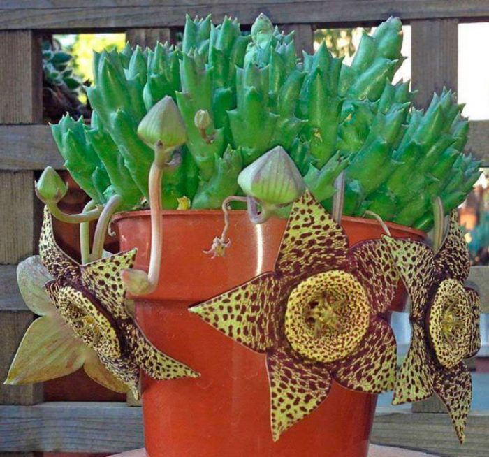 jak tylko zakwitnie Stapelia, wszyscy w pokoju natychmiast się o tym dowiedzą, a stanie się tak z powodu nieprzyjemnego zapachu kwiatu. Ten niezwykle niezwykły aromat dla kwiatu rosnącego na wolności jest niezbędny do przyciągnięcia much padlinożernych należących do rodziny Calliphoridae, które są owadami zapylającymi. Faktem jest, że ten zapach podoba się tym owadom. Muchy zapylają kwiat, a także układają w nim składanie jaj. Należy jednak wiedzieć, że gatunek stapeli flavo-purpurea, którego ojczyzną jest Namibia, ma stosunkowo przyjemny aromat wosku. Ale zły zapach emanujący z kwiatu nie odstrasza ogrodników, Stapelia i do dziś jest bardzo popularna. Aby mieszkanie nie pachniało zgnilizną podczas kwitnienia tej rośliny, zaleca się przeniesienie jej na balkon, a problem zostanie rozwiązany. Kwitnienie trwa około pół miesiąca.