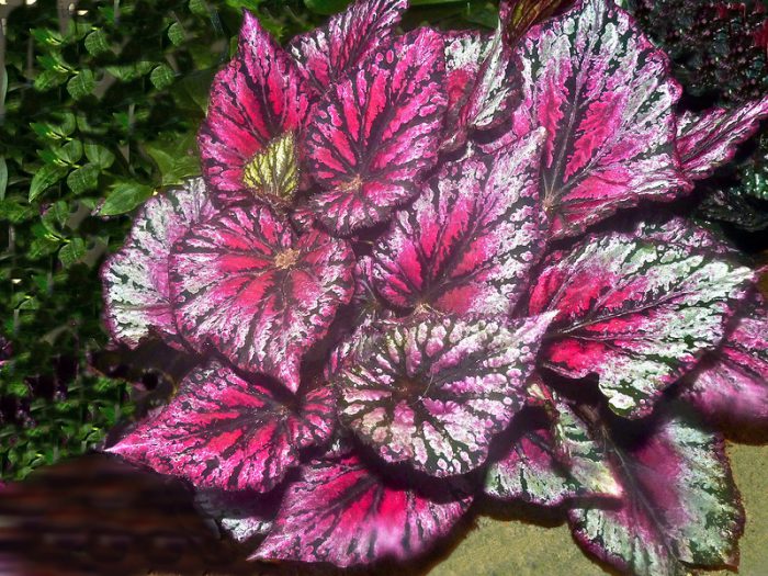 Ojczyzną takiego kwiatu są wschodnie Indie. Jest uważany za jeden z najpiękniejszych. Hodowcy wykorzystali ten gatunek do stworzenia wielu dekoracyjnych odmian liściastych, a także form hybrydowych. Roślina ma kłącze, które jest pogrubione, a jej spektakularne duże płytki liściowe są nagie lub z niewielkim pokwitaniem o szerokości 20 centymetrów i długości 30 centymetrów. Ich kształt serca jest asymetryczny, ich krawędź jest nierównomiernie ząbkowana lub falista. Kolor liści może być brązowo-brązowy, szkarłatno-aksamitny lub fioletowo-czerwony, czasami na ich powierzchni można zobaczyć plamki srebrnego lub fioletowo-czerwonego koloru. Istnieją formy hybrydowe, których płytki liściowe są prawie czarne, a na ich powierzchni znajdują się szkarłatne plamki. Podczas kwitnienia pojawiają się różowe kwiaty, które nie mają specjalnej wartości dekoracyjnej.