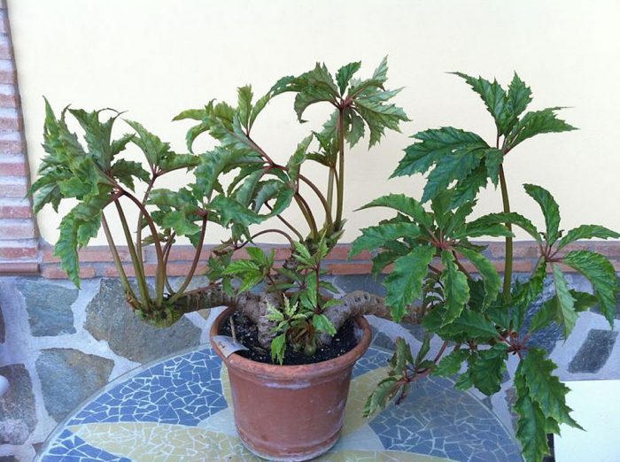 ta Begonia należy do najstarszych kwiatów domowych. Jej ojczyzną jest Meksyk. Grubość pełzającego pędu wynosi około 4 centymetrów. Duże palcowe rozcięte płytki liściowe znajdują się na ogonkach zielonkawo-żółtego koloru. Długość liści nie przekracza 35 centymetrów, istnieje wyraźnie widoczne żyłkowanie. Różowo-zielone kwiaty są częścią luźnych kwiatostanów w kształcie pędzla. Kwitnienie rozpoczyna się w lutym.