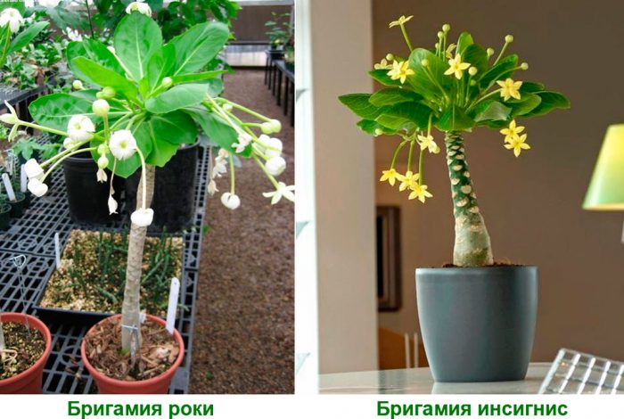 wyróżnia się 2 gatunki takiej rośliny: brigamia Rocky (Brighamia rockii) i brigamia insignis (Brighamia insignis). Mają duże podobieństwo w wyglądzie. Różnią się łodygami, więc u brighamia Rocky jest bardziej spuchnięty u podstawy i stopniowo zwęża się ku wierzchołkowi. Nawet w brigamia insignis kwiaty mogą mieć białawo-żółty lub biały kolor, a w brigamia Rocky ― głównie tylko żółty. Jednak na tej podstawie nie jest możliwe dokładne określenie rodzaju rośliny, ponieważ białe i żółte kwiaty mogą być obecne na jednym okazie. Z reguły Korona zawiera 5 płatków, ale jednocześnie występują kwiaty z 6 lub 7 płatkami i u obu gatunków. Owoce są dwukomorowymi suchymi wieloziarnistymi, które mogą osiągnąć długość od 1,5 do 2 centymetrów, a szerokość od 1 do 1,5 centymetra. Dojrzały owoc pęka w 2 rowkach nasiennych, po czym zawarte w nim nasiona wylewa się. Owalne małe nasiona osiągają zaledwie 0,1 centymetra długości. Dwa rodzaje takich roślin różnią się również nasionami. Tak więc nasiona brighamia Rocky są gładkie, a brighamia insignis ma małe guzki na swojej powierzchni, w związku z czym są szorstkie w dotyku.