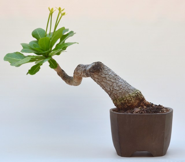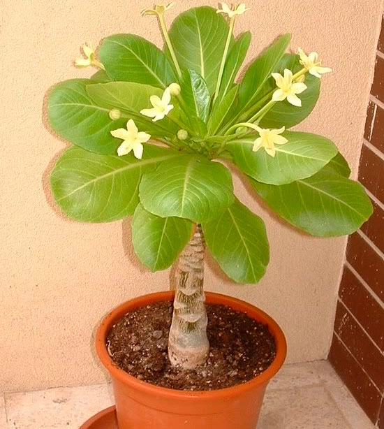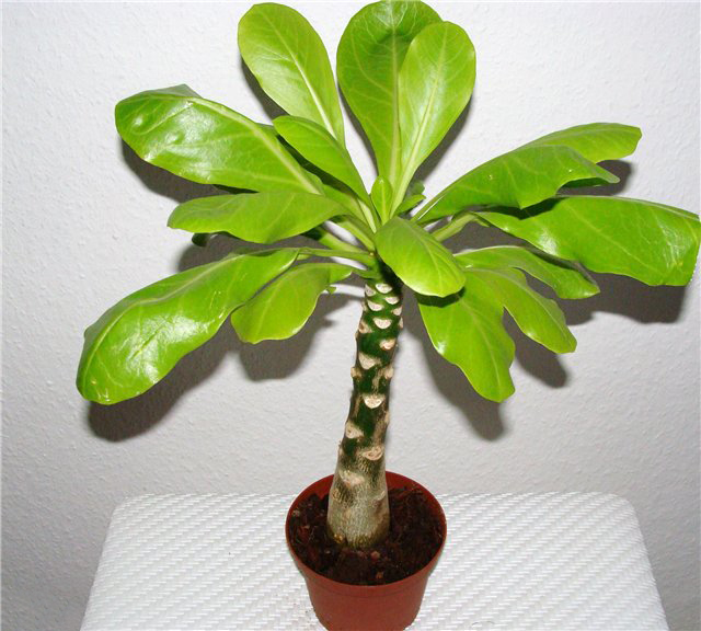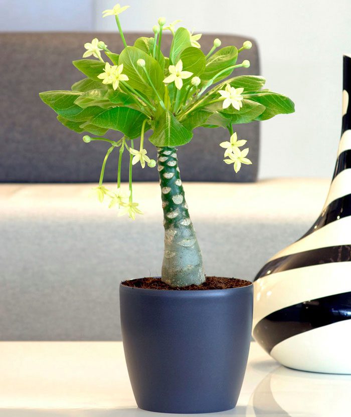 niezwykła łodyga w kształcie butelki takiego sukulentu jest bardzo mięsista i może gromadzić się w niej dość duża ilość wilgoci. Dzięki temu roślina jest w stanie przetrwać dość długi suchy okres. W górnej części łodygi znajdują się błyszczące płytki liściowe zebrane w rozety. Długość tych jasnozielonych liści może wynosić nie więcej niż 30 centymetrów. Na ich powierzchni znajduje się warstwa wosku, a na zewnątrz są podobne do liści kapusty. Liście znajdujące się poniżej mogą zmienić kolor na żółty w procesie wzrostu i spaść. W miejscu, w którym są przymocowane do łodygi, powstaje białawy mleczny sok, który nie stanowi żadnej szkody. W warunkach naturalnych ten soczysty może osiągnąć wysokość 3 metrów, a będąc w warunkach pokojowych, jego wysokość prawie nigdy nie przekracza 100 centymetrów. Pień młodego okazu jest zielony i gładki, gdy rośnie, jego kolor staje się szary, a na powierzchni powstają blizny (ślady martwych płytek liściowych). Jasnożółte kwiaty składające się z 5 płatków znajdują się w grupach po 3-8 sztuk. Corolla ma średnicę od 1 do 3 centymetrów, długość rurki waha się od 7 do 14 centymetrów.