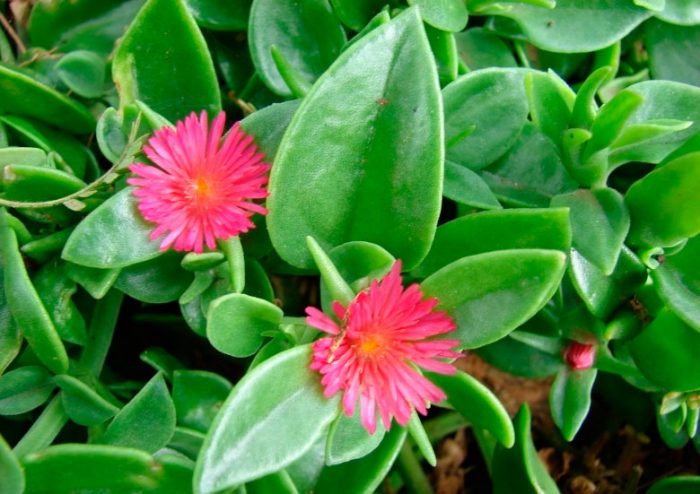 albo mezembryanthemum sercelistic (Mesembryanthemum cordifolium) — ta zimozielona roślina jest byliną i rośnie stosunkowo szybko. Rozłożyste łodygi pełzają. Zielonkawo-szare mięsiste łodygi mają owalny lub czworościenny kształt w przekroju. Nasycone zielone naprzeciw mięsiste liście mają kształt sercowato-lancetowaty i nie przekraczają 2,5 centymetra długości. Małe samotne wielopłatkowe kwiaty mogą być pachowe lub wierzchołkowe. Mogą być pomalowane na liliowo-różowy, nasycony purpurowy lub szkarłatny kolor.