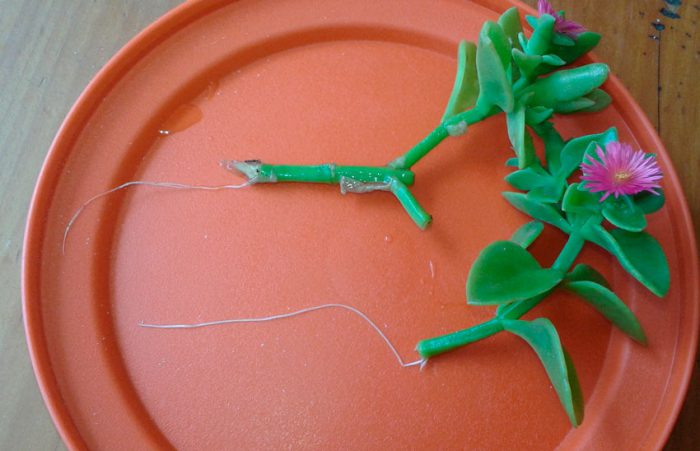 przed posadzeniem sadzonek pozostawia się je w suchym, zaciemnionym miejscu na kilka godzin do wyschnięcia. Do ukorzenienia można użyć wermikulitu, zwilżonego piasku lub piasku zmieszanego z zakupioną glebą dla sukulentów. Do tego celu nadaje się również szklanka wody, ale należy do niej wlać niewielką ilość węgla aktywowanego. Po ukorzenieniu rośliny przesadza się do osobnych doniczek o średnicy od 5 do 7 centymetrów.