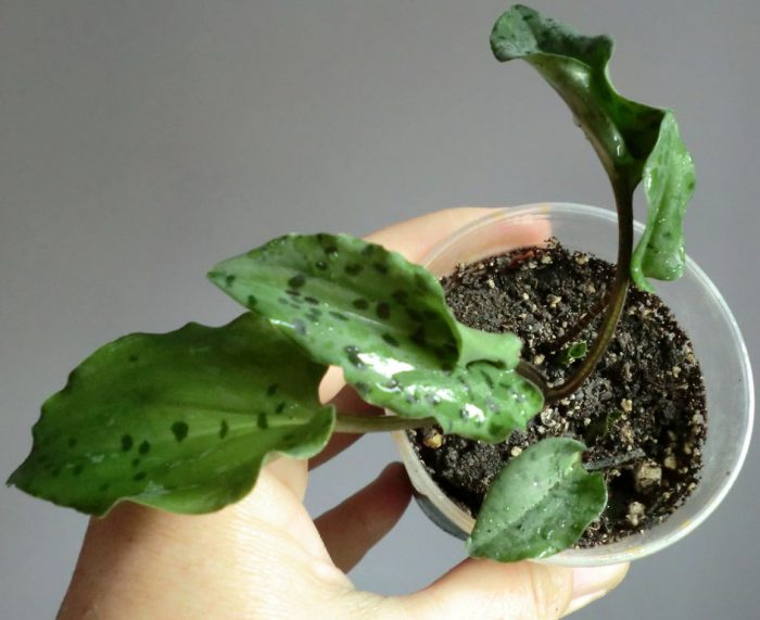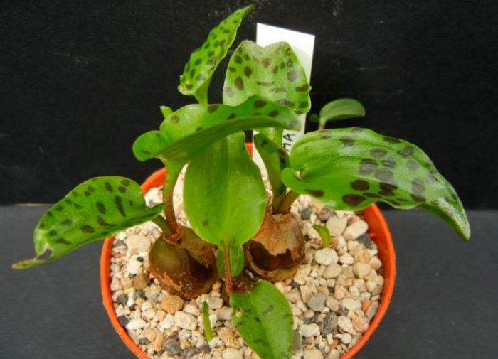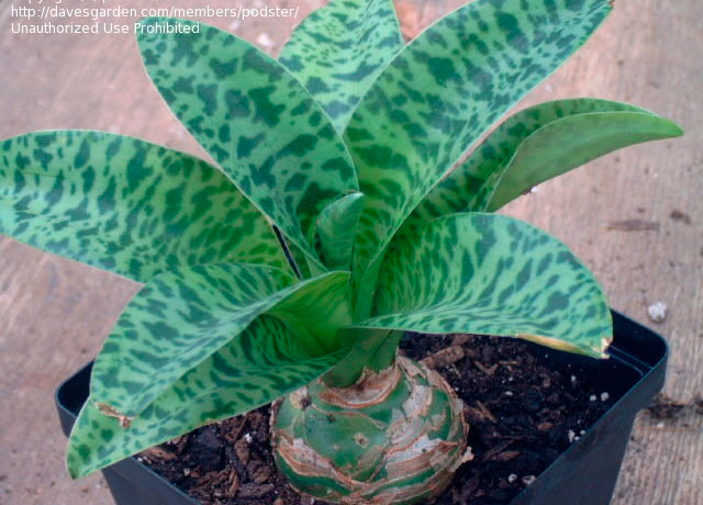 ta zimozielona roślina jest bulwiasta i ma wyraźny okres spoczynku. Zaokrąglona żarówka jest pomalowana na biało. Sztywne lancetowate liście zwężają się do podstawy. Są pomalowane na nasycony zielony kolor, a na ich powierzchni znajdują się ciemnozielone plamki, poniżej-zielonkawo ― szare. Takie liście osiągają długość 40 centymetrów i szerokość 5 centymetrów. Ogonki albo nie, albo są bardzo krótkie. Długość szypułki waha się od 20 do 40 centymetrów. Kwiatostan w kształcie kolca nosi małe białe kwiaty. Kwitnienie obserwuje się od marca do września.