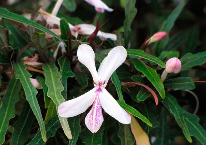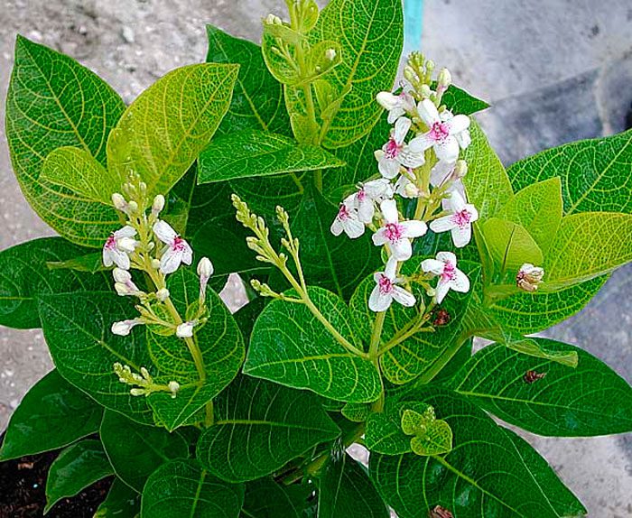 wysokość takiego krzewu może wynosić od 50 do 100 centymetrów. Długość krótkich liści wynosi 12-15 centymetrów i mają podłużny spiczasty kształt. Ich Zielona falista powierzchnia ma gęstą sieć pasków pomalowanych na złoto-żółty kolor. Średnica białych kwiatów wynosi około 3,5 centymetra. Mają krótkie szypułki, a paszcza korony jest pomalowana na Czerwono.