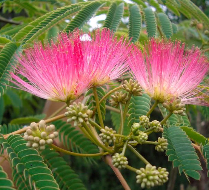 Wysokość takich krzewów liściastych może wynosić od 6 do 8 metrów. Liście są pierzaste, różowe kwiatostany w kształcie główki lub kolca i wyglądają podobnie do akacji.