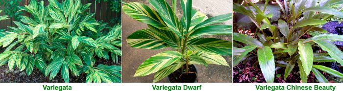 - « Variegata " - płytki liściowe mają dużą szerokość, a na ich powierzchni znajdują się żółtawe paski o różnych kierunkach i szerokości.