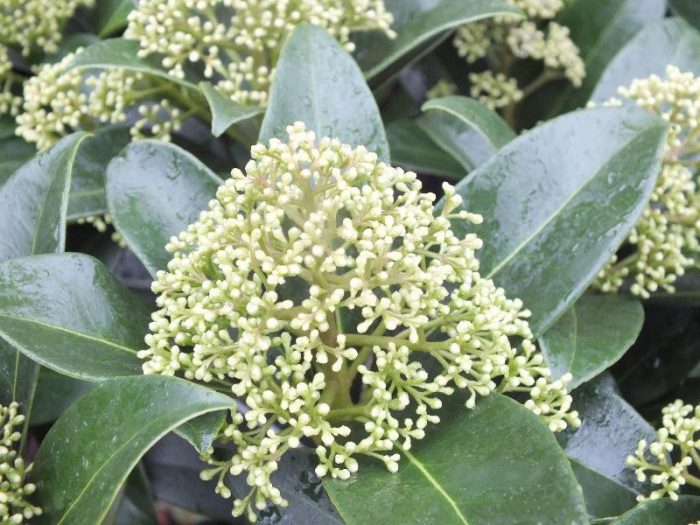 Skimmia japońska (Skimmia japonica) - wysokość takiej dwupiennej rośliny może osiągnąć od 100 do 150 centymetrów. Aby uzyskać jagody z tego rodzaju skimmii, konieczne będzie sadzenie rośliny żeńskiej i męskiej w pobliżu. Małe żeńskie i męskie kwiaty w kształcie gwiazdy są zbierane na różnych roślinach w wierzchołkowe kwiatostany w kształcie wiechy. Kwitnienie rozpoczyna się w marcu lub kwietniu. Na początku okresu jesiennego na krzaku tworzą się błyszczące czerwone jagody.