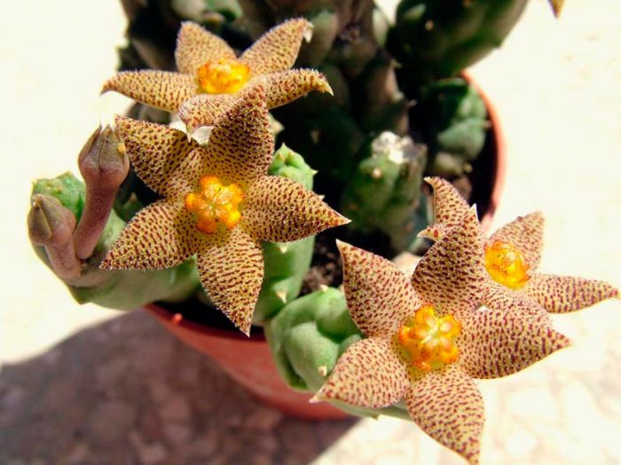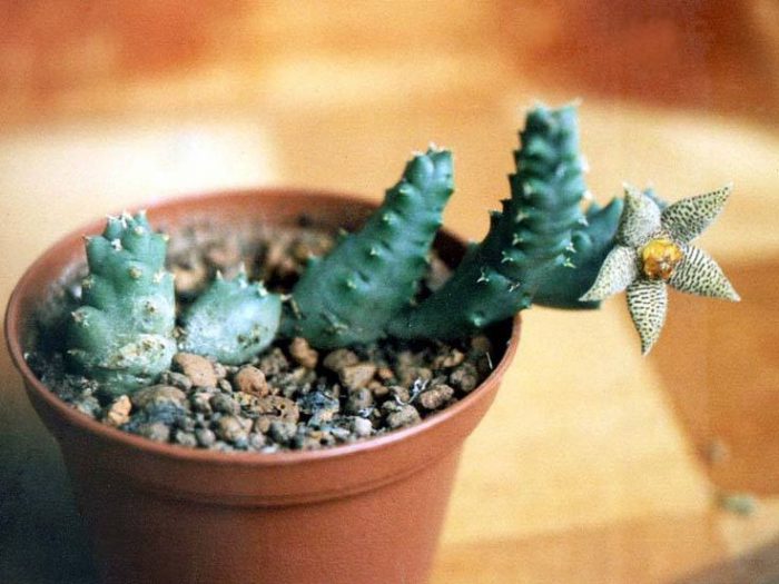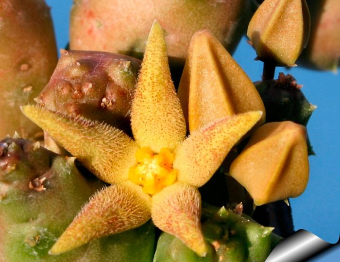 taka roślina jest sukulentem i ma pełzające pędy, które obejmują krótkie cztero-lub pięciokątne segmenty o długości sięgającej od 3 do 5 centymetrów i szerokości-1-1, 5 centymetra. Są pomalowane na brązowo-zielony lub zielony odcień, a na każdej z twarzy znajdują się 4 lub 5 spiczastych ząbków. Małe kwiaty znajdują się na szczycie łodyg, Corolla jest zaokrąglona, rurka jest płaska lub w kształcie dzwonu. Gwiaździste, pięciopłatkowe płatki mają trójkątny spiczasty kształt. Kwiaty mogą być malowane w różnych odcieniach kolorów, a na powierzchni są plamy.