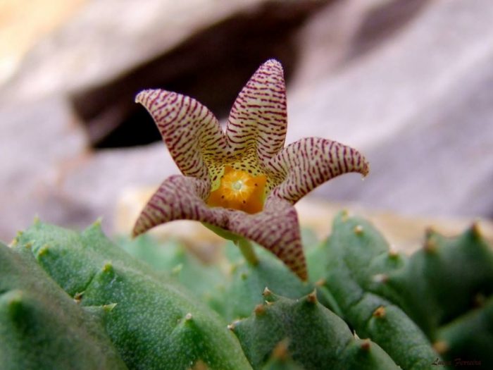 to wieloletni soczysty. Jego jasnozielone łodygi mogą być nieco szorstkie lub gładkie, unoszące się lub pełzające. Ich długość waha się od 2 do 5 centymetrów, a szerokość wynosi 1 centymetr. Pędy są podzielone na przysadziste krótkie segmenty o kształcie maczugi lub cylindrycznym i tępych żebrach, z których każdy ma od 2 do 4 małych ząbków. Gwiaździste, pięciopłatkowe kwiaty mają aksamitną powierzchnię. Mięsiste płatki są pomalowane w kolorze kości słoniowej, a na powierzchni znajdują się brązowo-czerwone kropki lub poprzecznie rozmieszczone paski. Z kwiatów emanuje niezbyt przyjemny zapach.