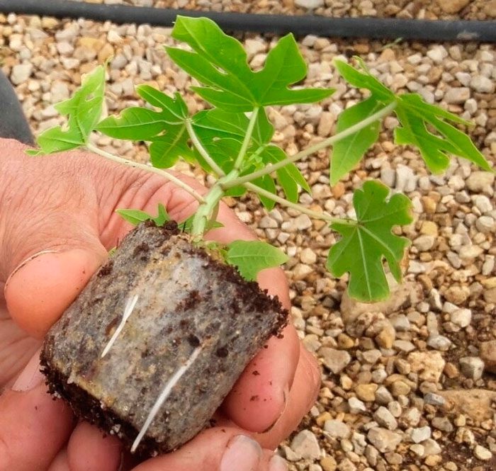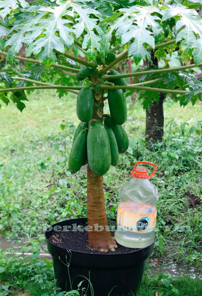 sadzenie młodej rośliny odbywa się w niezbyt dużej doniczce. Należy pamiętać, że mała roślina ma mały system korzeniowy, który nie będzie w stanie pokryć całego podłoża w naczyniu objętościowym, w wyniku czego gnicie rozpocznie się z powodu przelewu. Papaja posadzona w doniczce objętościowej może również zacząć budować masę wegetatywną, a kwitnienie jest bardzo rzadkie. Podczas przesadzania rośliny średnica nowego pojemnika powinna być tylko o 2 lub 3 centymetry większa niż poprzednia.