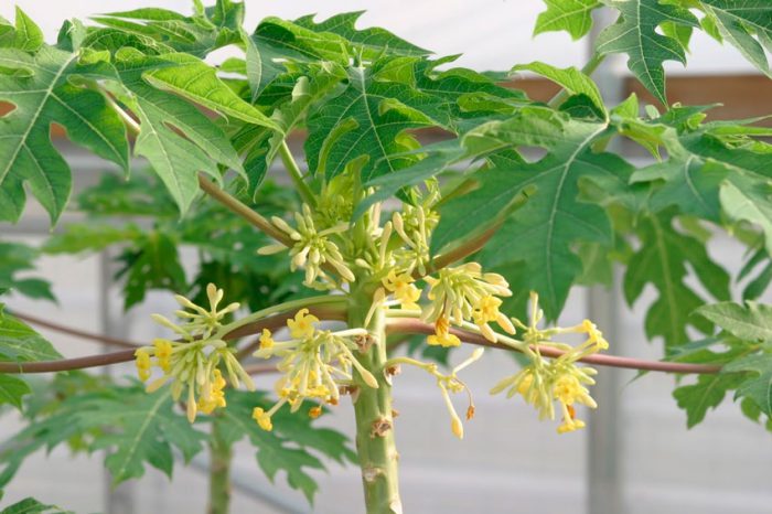 taka roślina jest dwupienna. Jednak dzięki hodowcom narodziły się odmiany Biseksualne. Tak więc kwiaty męskie i żeńskie rosną na tych roślinach w tym samym czasie i nazywane są płodnymi. W przypadku, gdy papaja domowa kwitnie, ale nie wydaje owoców, może to oznaczać, że masz przed sobą okaz żeński lub męski. W tej chwili bardzo popularne są samozapłodnione odmiany, które można swobodnie kupić w specjalistycznym sklepie. Z osobnika dwupłciowego rosnącego w warunkach pokojowych lub w szklarni trudno jest osiągnąć owocowanie. Aby to zrobić, potrzebujesz 2 roślin: żeńskiej i męskiej. Konieczne będzie również, aby ich kwitnienie zaczęło się w tym samym czasie, tylko wtedy możliwe będzie zapylenie.