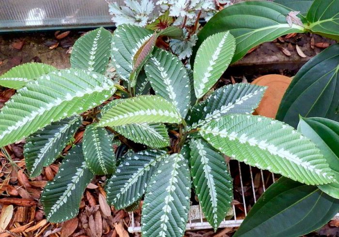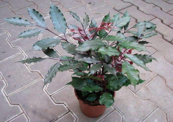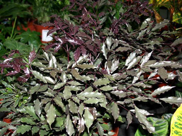 to zimozielony krzew. Płytki liściowe są pierzaste i składają się z pojedynczych lancetowatych małych liści, których krawędzie są spiczaste. Górna powierzchnia liści jest zielonkawo-brązowa, błyszcząca i ma białawy szeroki pasek biegnący pośrodku, podczas gdy dolna jest czerwonawo-fioletowa, a środkowy pasek jest pomalowany na Zielono.
