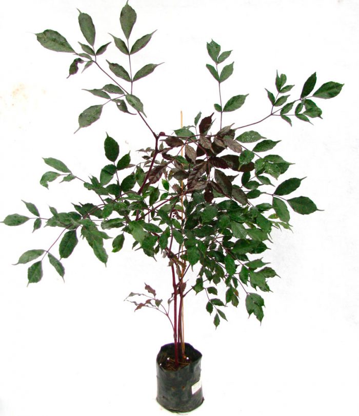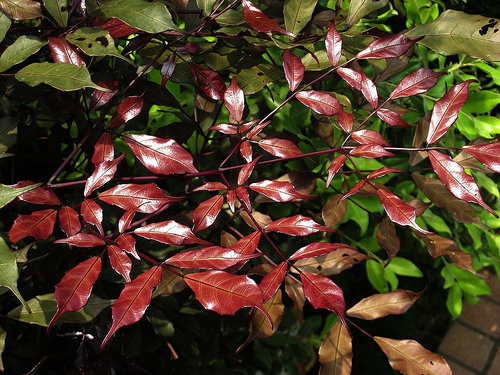 ten krzew jest wiecznie zielony. Lancetowate, złożone, spiczaste liście mają błyszczącą powierzchnię i długość do 60 centymetrów. Młode liście mają brązowy kolor, a następnie zmieniają się w ciemnozielone. Kolor kwiatów jest ceglastoczerwony.