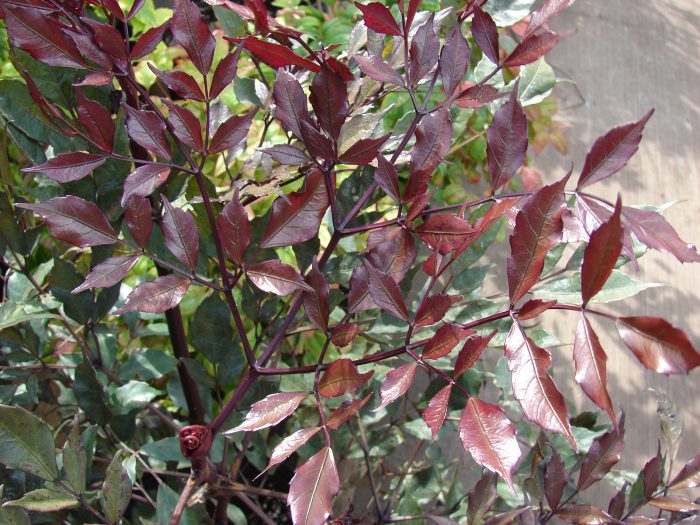 ten zimozielony krzew ma szorstkie, ale często błyszczące pędy, których wysokość może wynosić od 90 do 120 centymetrów. Pierzaste lub proste błyszczące liście, w niektórych odmianach mają czerwonawy lub brązowy połysk. Kwiatostany mogą być zarówno wierzchołkowe, jak i pachowe. Małe kwiaty mają niską dekoracyjność. Owoce są reprezentowane jako jagody.
