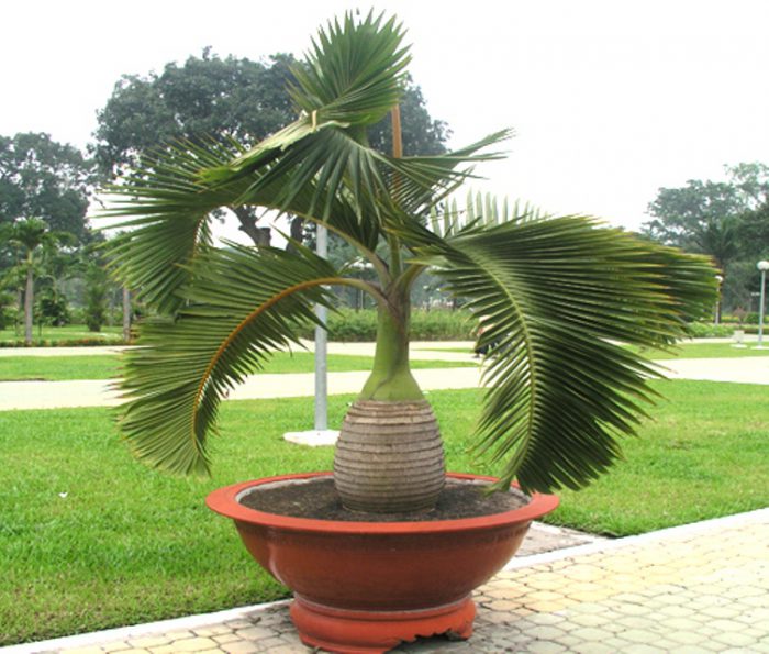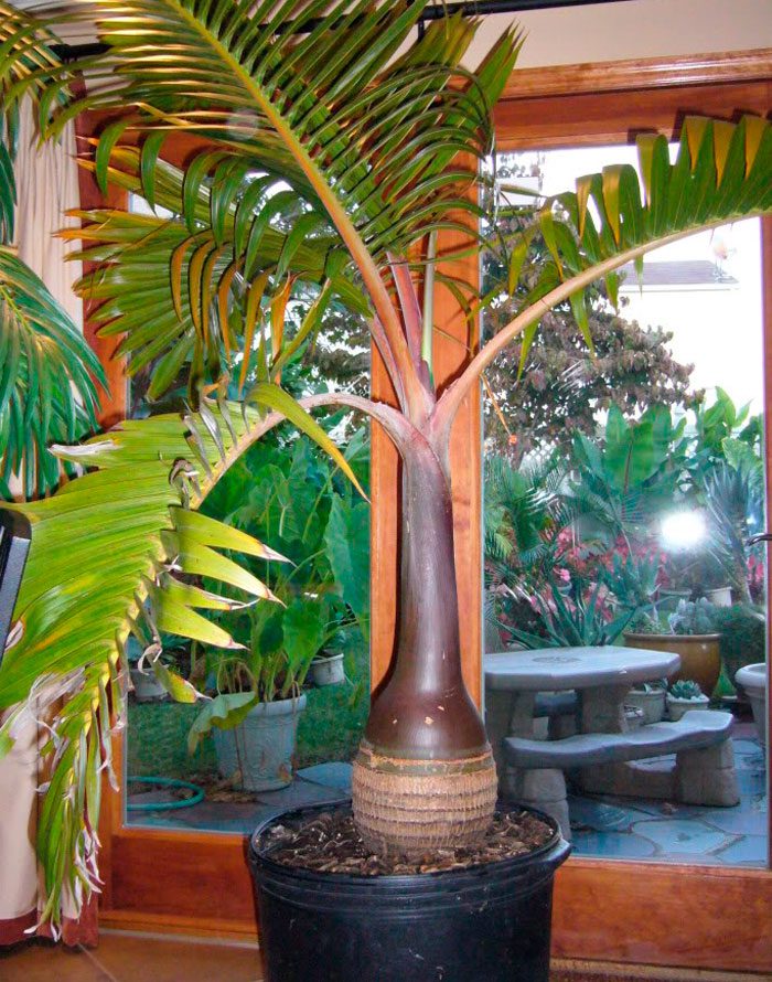 taka Palma rośnie bardzo powoli i ma stosunkowo krótki pień (nie więcej niż 150 centymetrów wysokości). Lufa ma kształt butelki, a średnica wąskiej części wynosi 15 centymetrów, a szeroka ― 40 centymetrów. Pierzasty liść osiąga długość 150 centymetrów. Istnieje od 30 do 40 par piór liściowych o długości 40 centymetrów i szerokości 5 centymetrów. Jasnoczerwony ogonek u podstawy osiąga 40 centymetrów długości. Pod koroną liści w wąskiej części pnia znajduje się kwiatostan, który osiąga długość od 40 do 50 centymetrów.