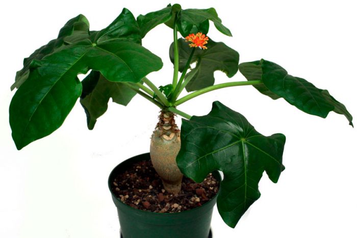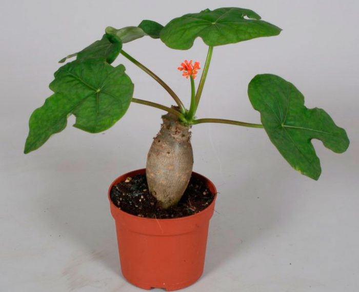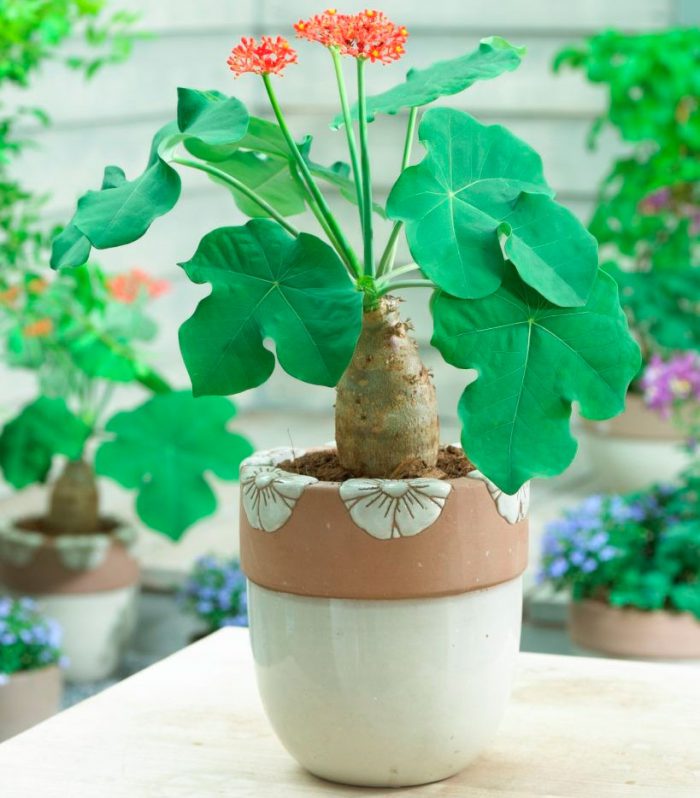 ta roślina może przynieść niespodziankę do każdego wnętrza nie gorszego niż Bonsai. Jego kwitnienie jest regularne, a jasne parasole na długich nogach wyglądają imponująco. Często najpierw jatrofa zaczyna kwitnąć, a następnie rosną liście o szerokich liściach, które mają długie ogonki o długości 10-20 centymetrów.