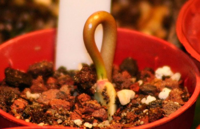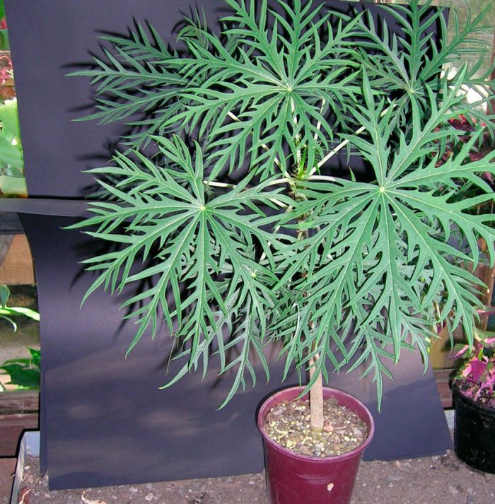do siewu stosuje się mieszaninę składającą się z liści i darni, torfu, a także piasku, które należy wziąć w równych częściach. Siew jest powierzchowny. Konieczne jest utrzymanie temperatury podłoża na poziomie 25 stopni. Przykryj pojemnik szkłem i umieść w ciepłym miejscu. Po 7-14 dniach pojawią się pierwsze pędy. Sadzonki sadzi się w osobnych pojemnikach. Rosną bardzo szybko. A po zaledwie kilku miesiącach niewiele różnią się od dorosłych okazów. Początkowo liście mają zaokrąglony kształt, a następnie stają się faliste. 2 lata po siewie płytki liściowe stają się klapowane. Pogrubienie pnia następuje stopniowo. Po raz pierwszy roślina zakwitnie w 2. roku życia.