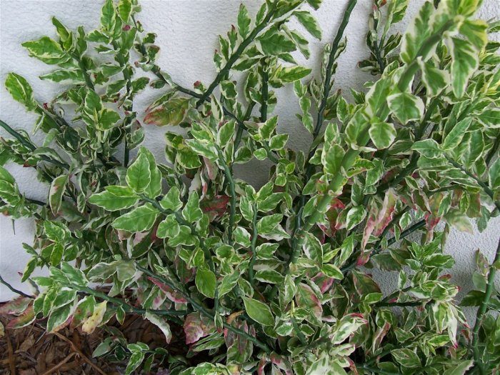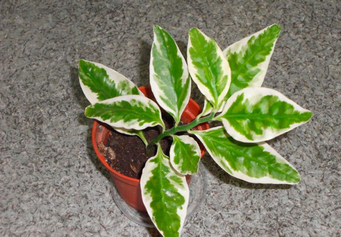 odmiana "Variegatus"ma różnorodne, faliste liście z krótkimi ogonkami. Jednocześnie na płytce liściowej znajduje się obramowanie porcelanowo-białego koloru, które zmienia się w jasnoczerwony lub różowawy kolor. Mięsisty zielony pęd ma kształt zygzaka, ponieważ podczas uprawy nowego liścia zmienia swój kierunek. Kwitnie w drugiej połowie okresu jesiennego. Kwiaty znajdują się w górnej części pędów, podczas gdy kwiatostany, które tworzą, mają błyszczące liście pokrywające czerwony kolor.
